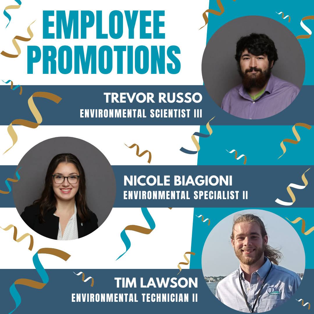 Trevor Russo (left) and Mitchell Lockwood joined CDW at the same time in the fall of 2023. They have demonstrated strong work ethics, positive attitudes, and critical thinking skills. Both have been promoted to Environmental Scientist II.